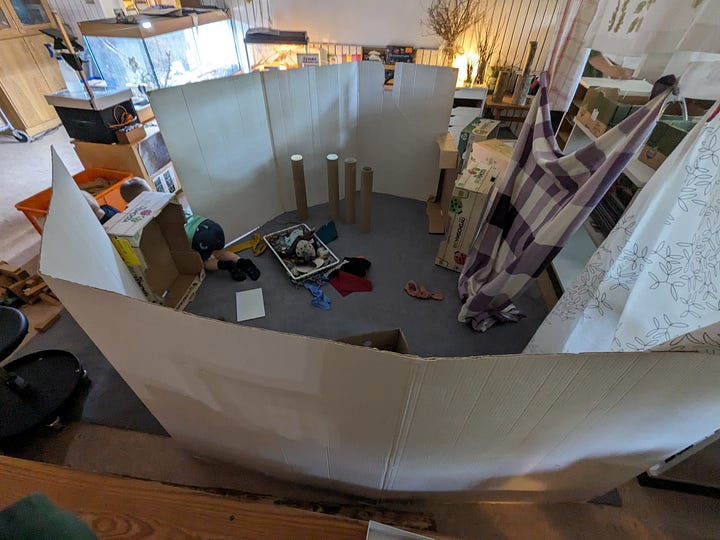Upon entering the classroom, we joined a teacher conducting a ‘lesson’. This lesson was not a traditional, structured session but rather an immersive experience that required the children to engage with the room. The room was filled with various loose parts, primarily consisting of recycled, natural, and processed materials. Several ‘projects’ were in progress within the room, each child exploring these within the context of their play.