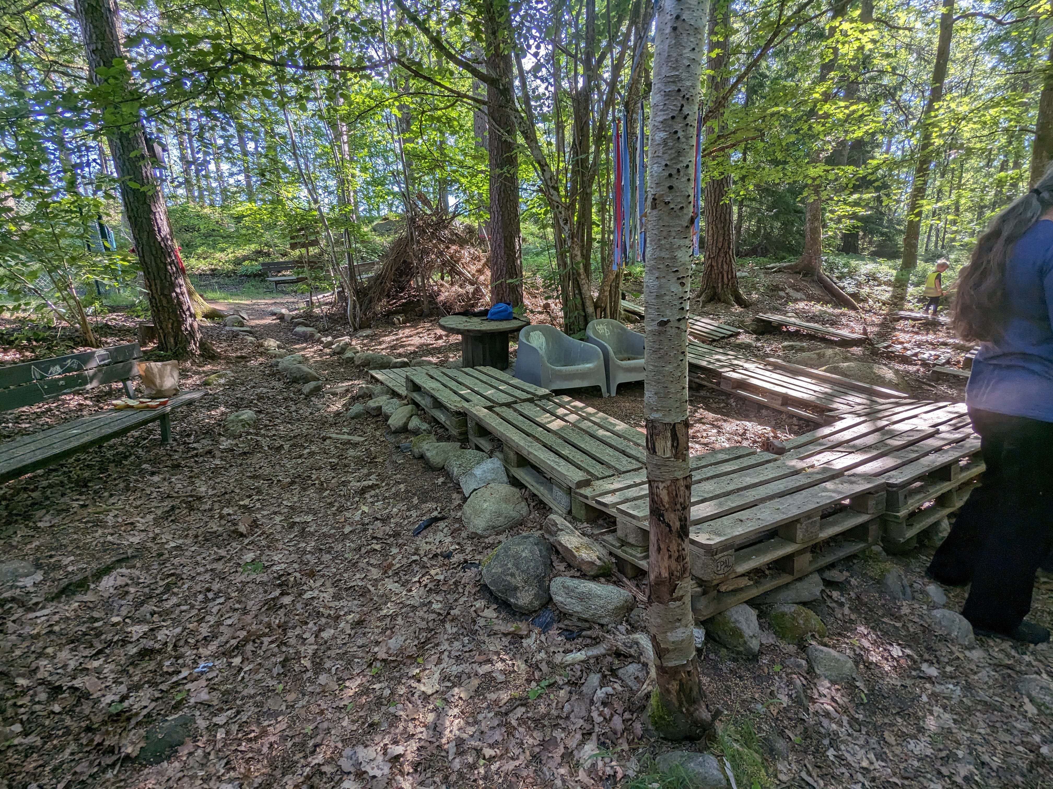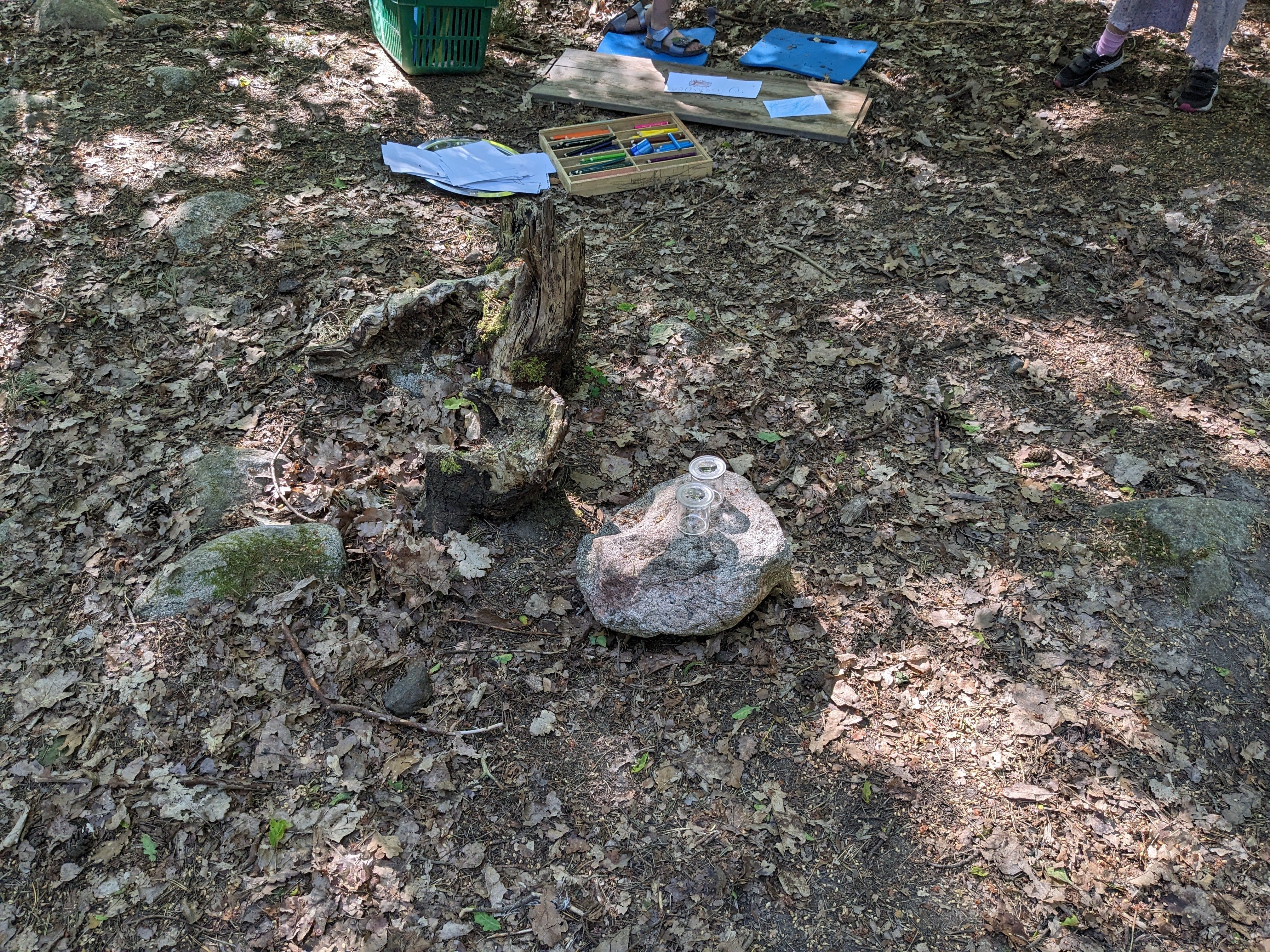 Suzanne and I first joined a group of older children who were spending time in the adjacent forest. I noticed that the materials brought into the forest by the preschool did not encourage any harm to the forest. Instead, these materials were used in harmony with nature. While some damage is inevitable, these materials were primarily used to foster joy, imagination, and curiosity. Pallets were arranged on the floor, creating a magical pathway; small jars were used for temporary bug observation before their release, and ropes were entwined around branches, connecting children to the tree through ‘play’. The children were indirectly taught to appreciate nature and develop a connection to its richness.